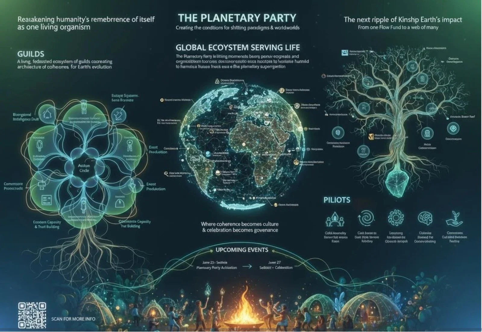 Like mycelium beneath a forest floor, the threads of the Planetary Party are spreading:Flow Funds nourishing local leadersFestivals becoming civic ceremoniesBioregional dashboards emerging as new ways to see the wholeYouth and elders sensing togetherLand-based hubs prototyping regenerative systemsIndigenous governance frameworks guiding our pathCooperatives and councils rising where central systems failCommunities regenerating culture through art and ritual The PPP is the connective tissue that helps these seeds recognize each other. Making the invisible architecture visible. The scattered, coherent. The future, actionable.